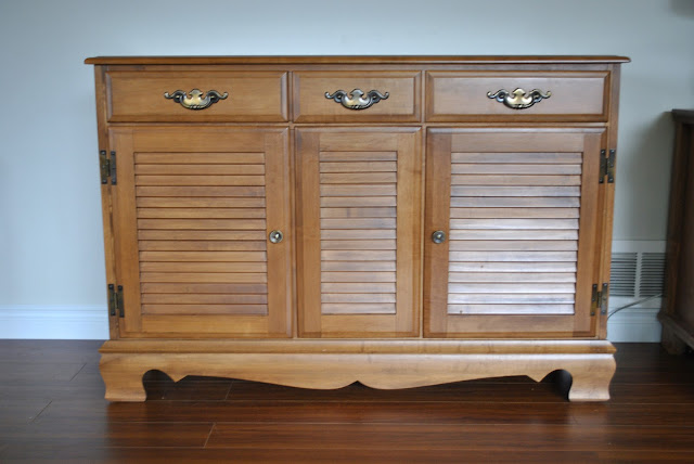 A great storage piece with one divided drawer and one extra large drawer and louvered doors, perhaps painted a white for a baby's room with a changing pad on top? or maybe a charcoal or black and then re-purposed as a bar?