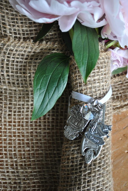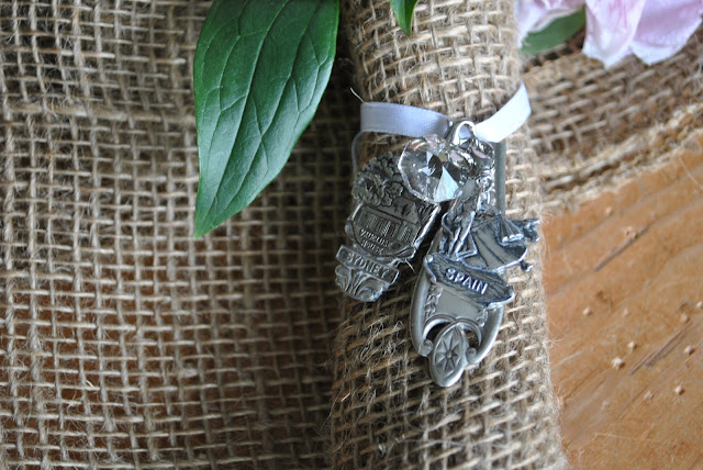 Any number of charms could be added to a bouquet. I added a charm for Spain depicting a bull fighter and a charm from Sydney, Australia. I imagine that these represent treasured travels of the couple. The charms might also represent the heritage of the couple, loved ones who have passed or who are not able to attend the wedding or even inspiration for the future.