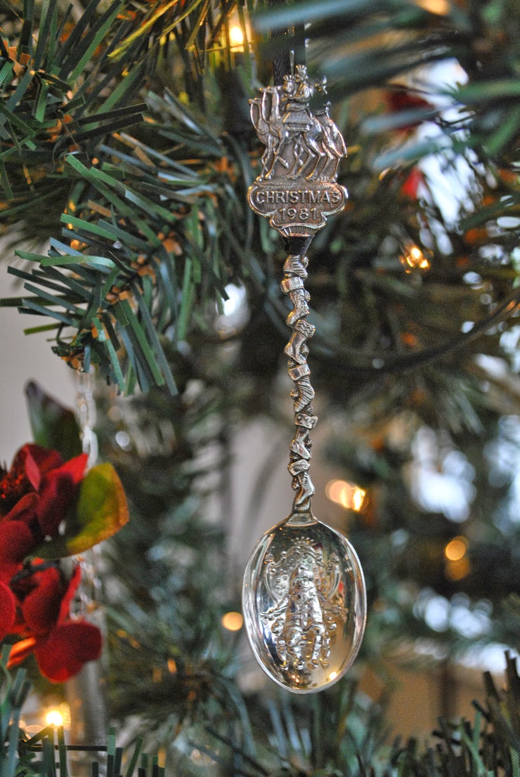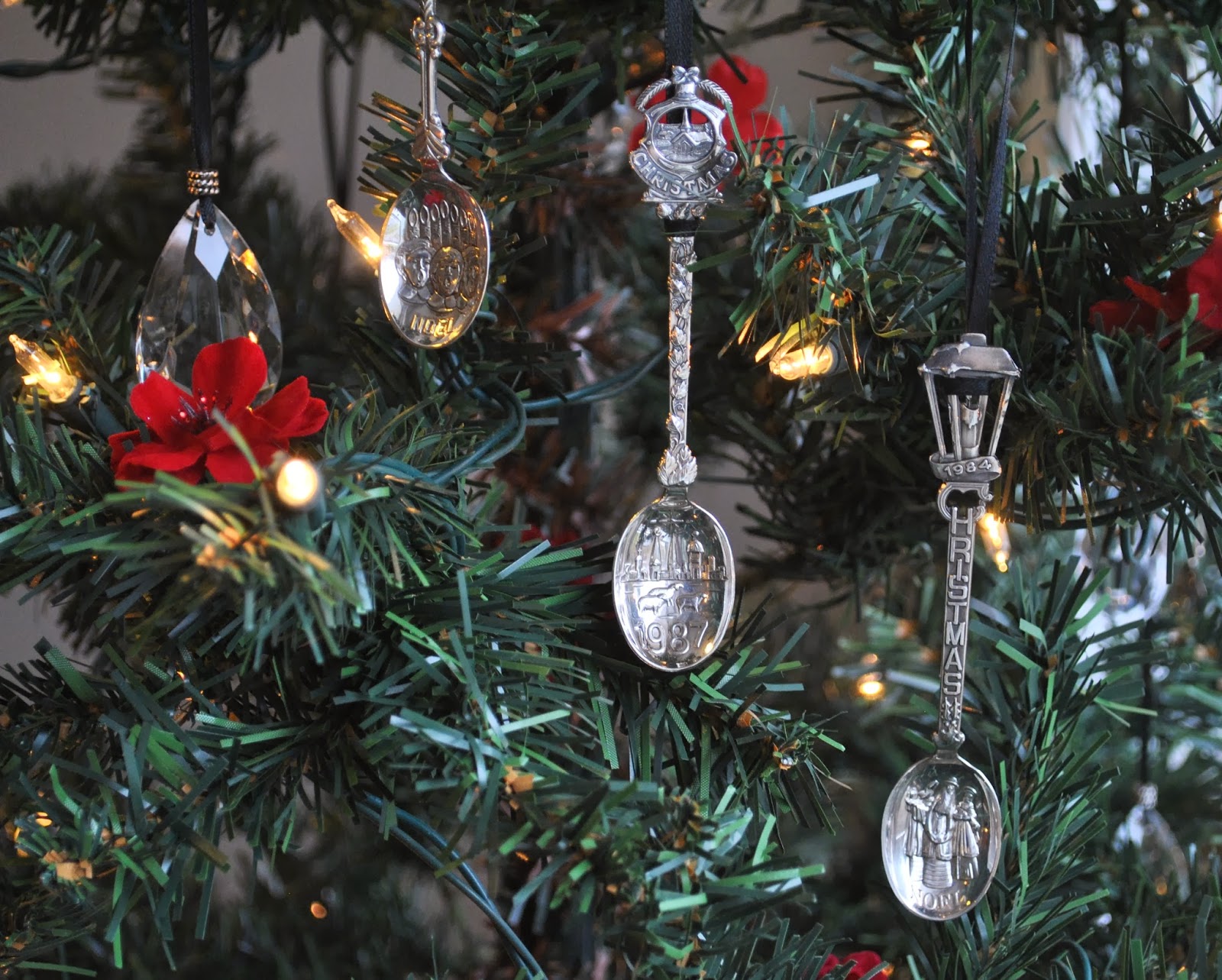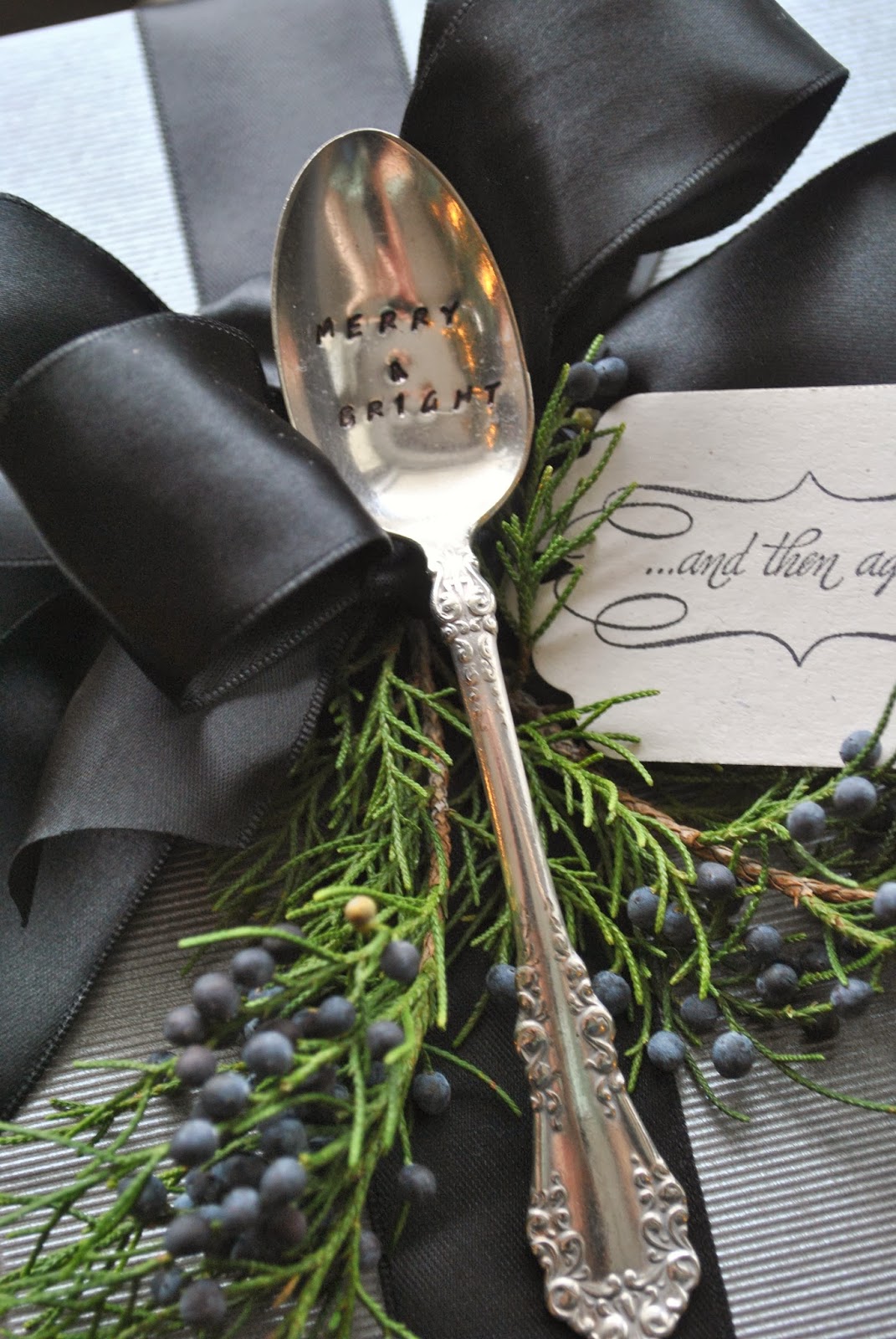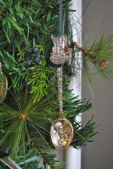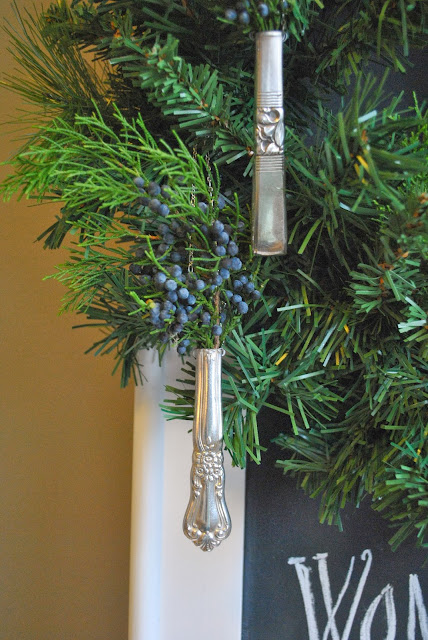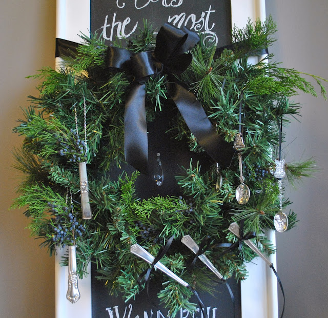 Reworked flatware handles hanging from black satin ribbon now resemble icicles.