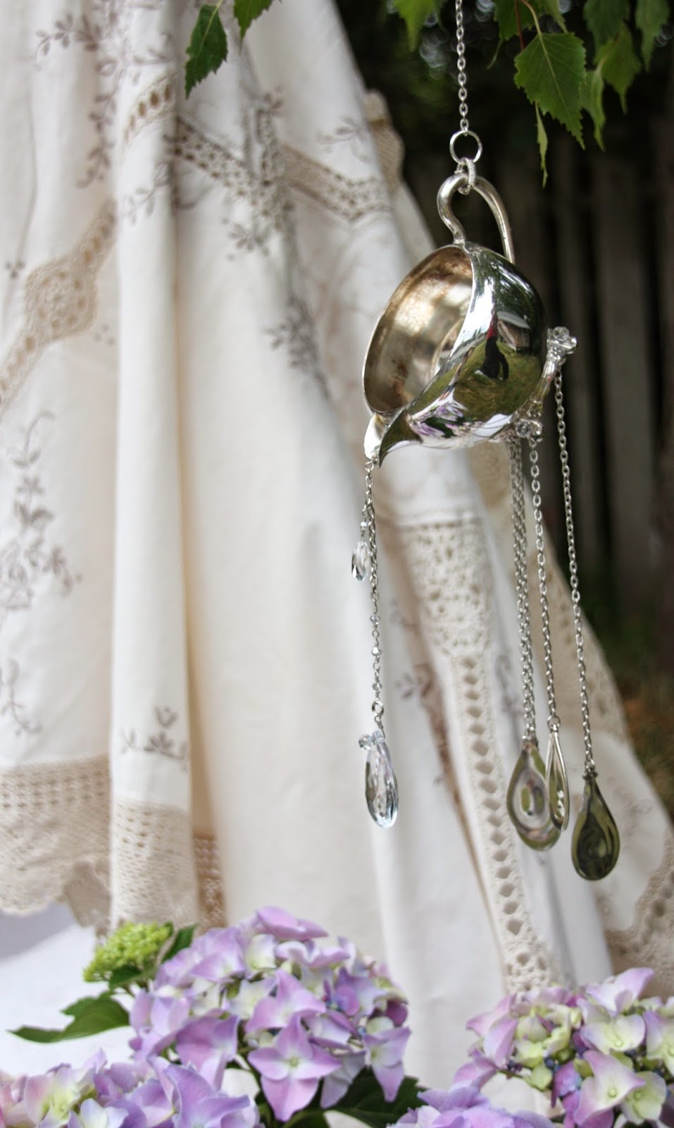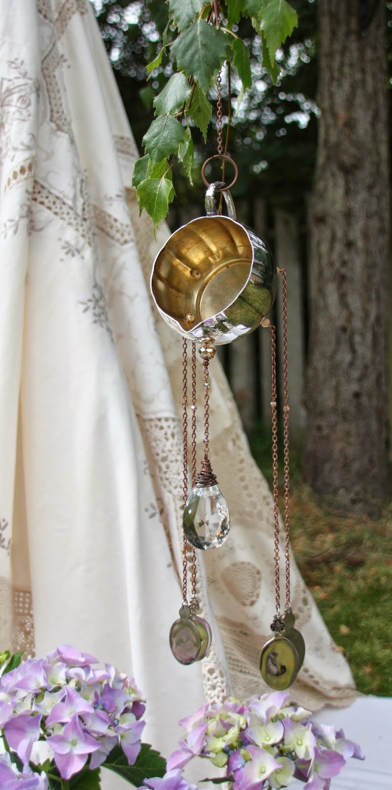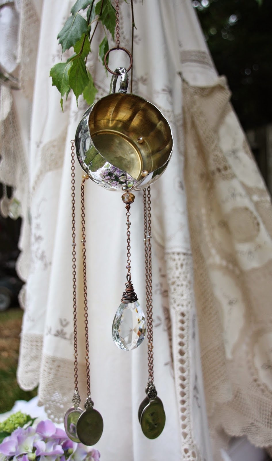 The clapper of this last windchime is made from the bottom of a wine goblet. The windchime itself is a chafing dish and allows space for flowers to be laid in the top.