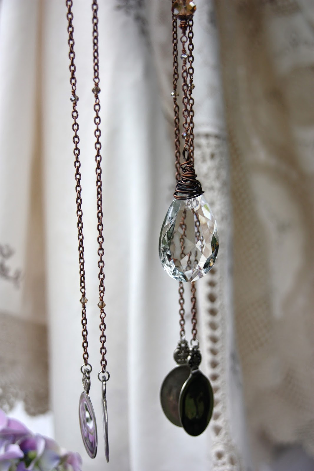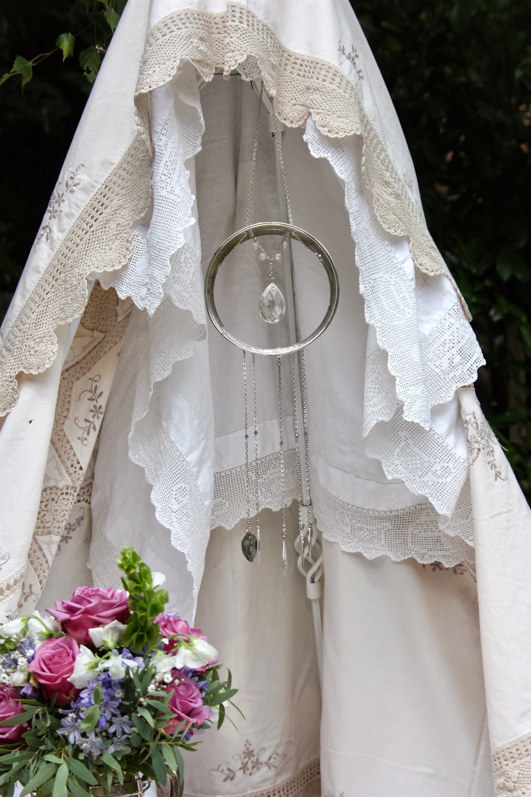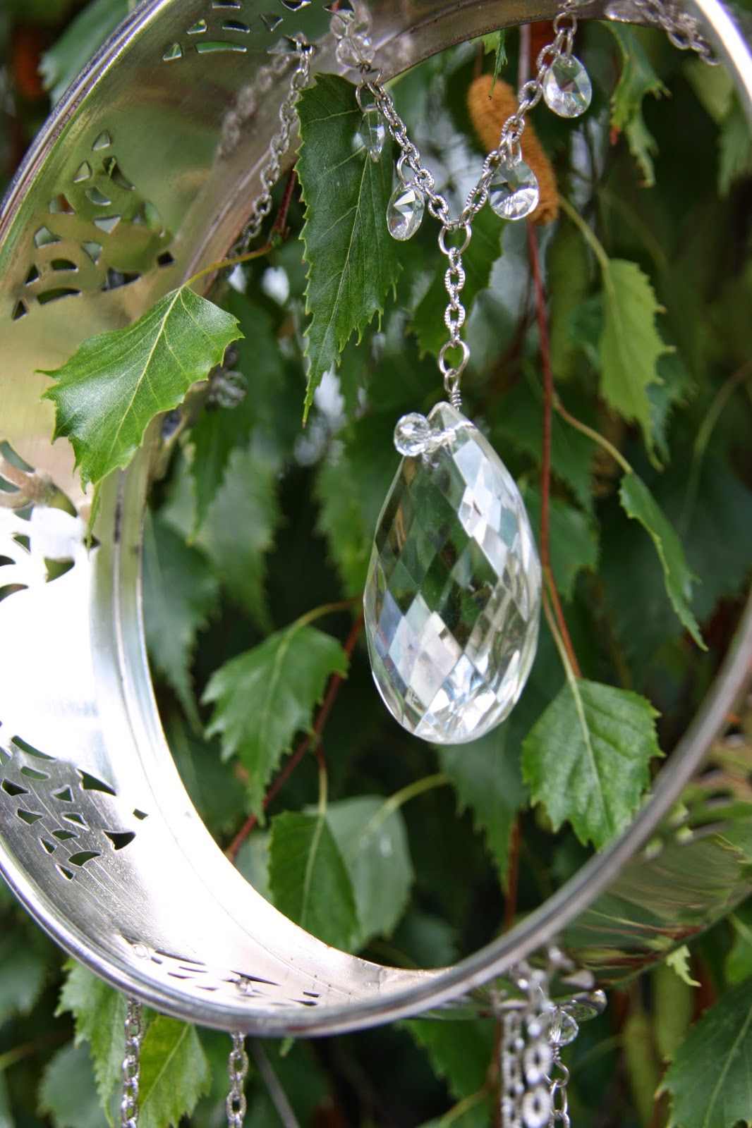 The clapper of this last windchime is made from the bottom of a wine goblet. The windchime itself is a chafing dish and allows space for flowers to be laid in the top.