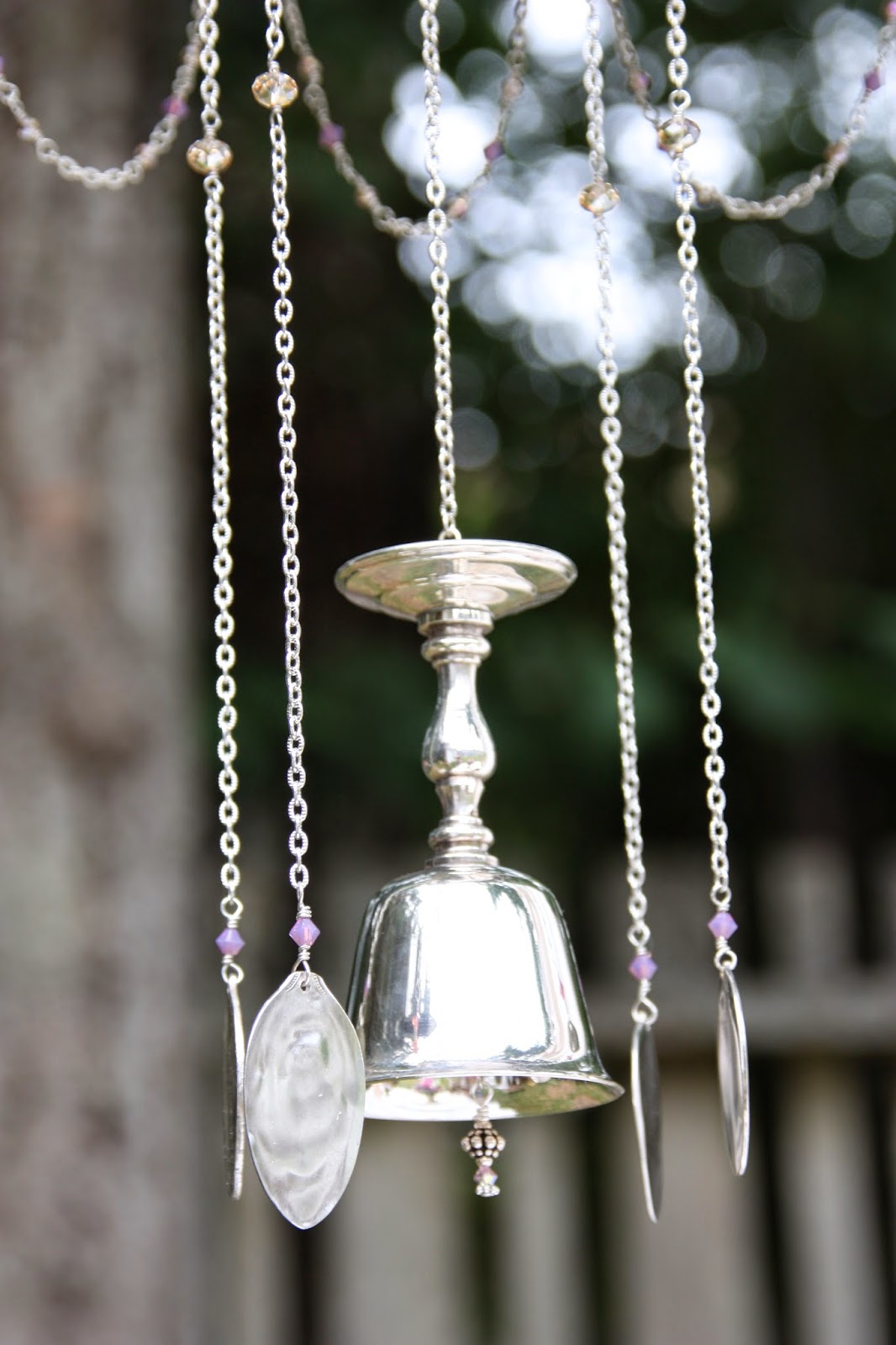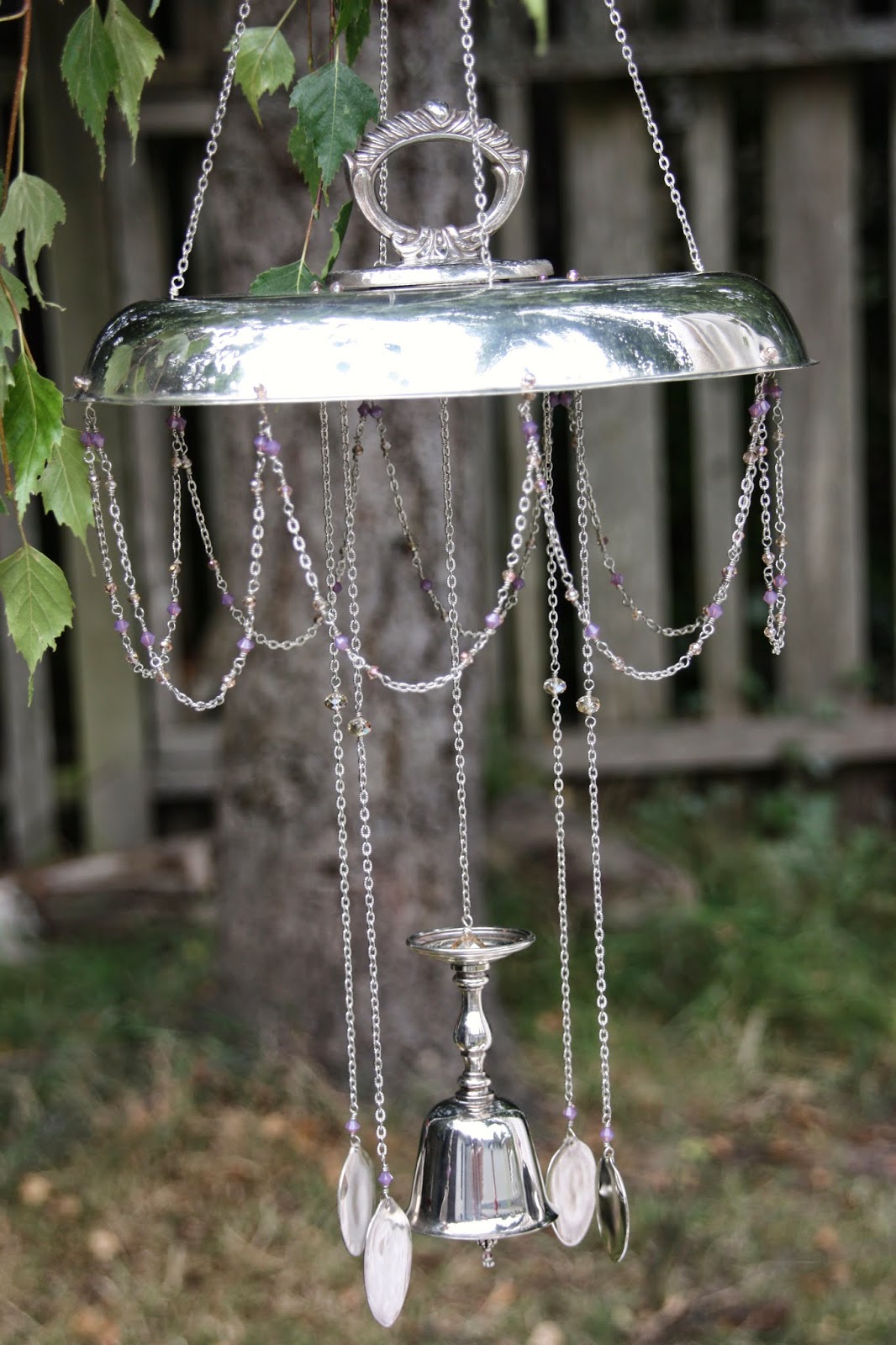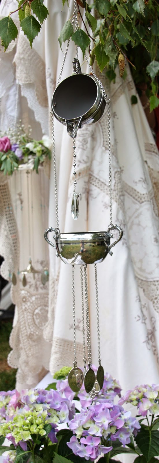 The clapper of this last windchime is made from the bottom of a wine goblet. The windchime itself is a chafing dish and allows space for flowers to be laid in the top.
