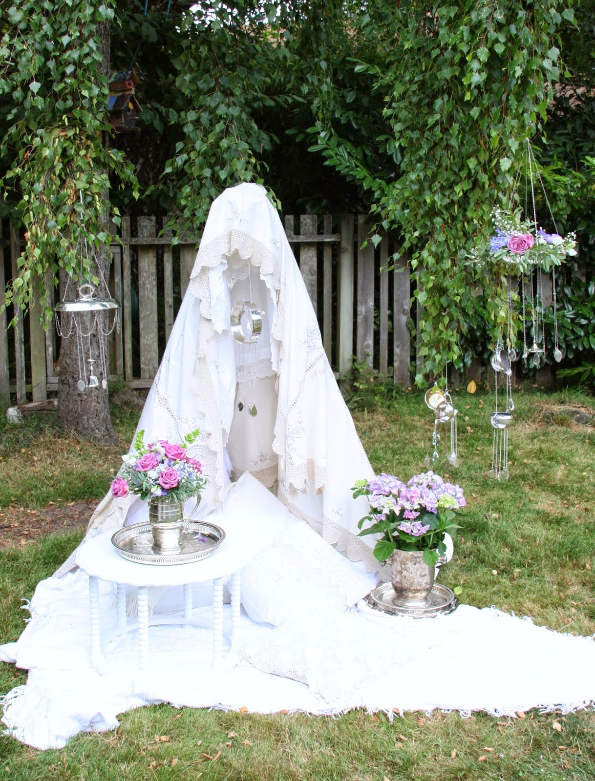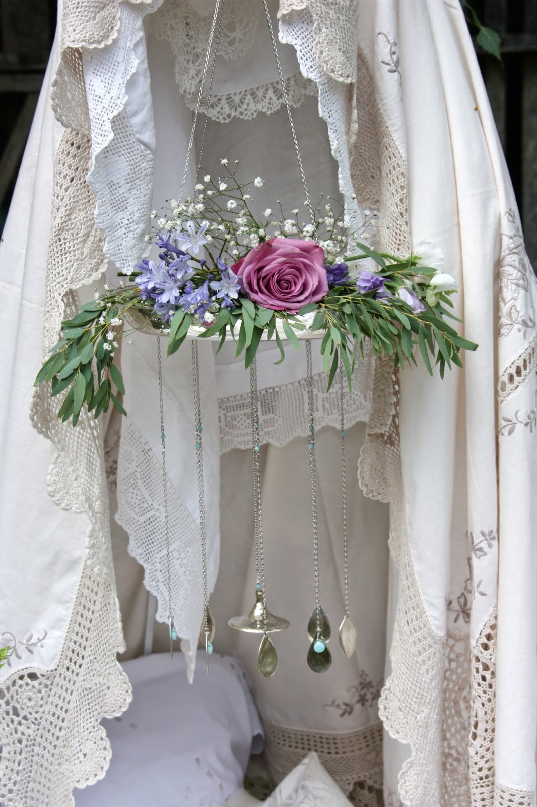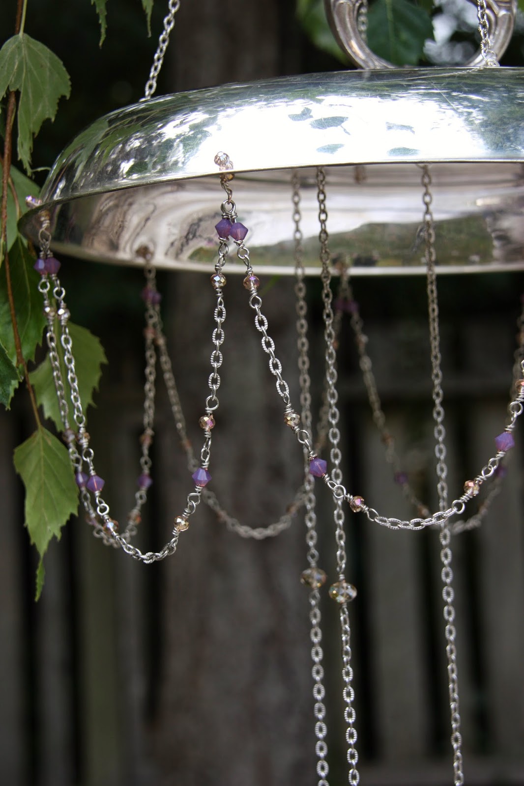 The clapper of this last windchime is made from the bottom of a wine goblet. The windchime itself is a chafing dish and allows space for flowers to be laid in the top.