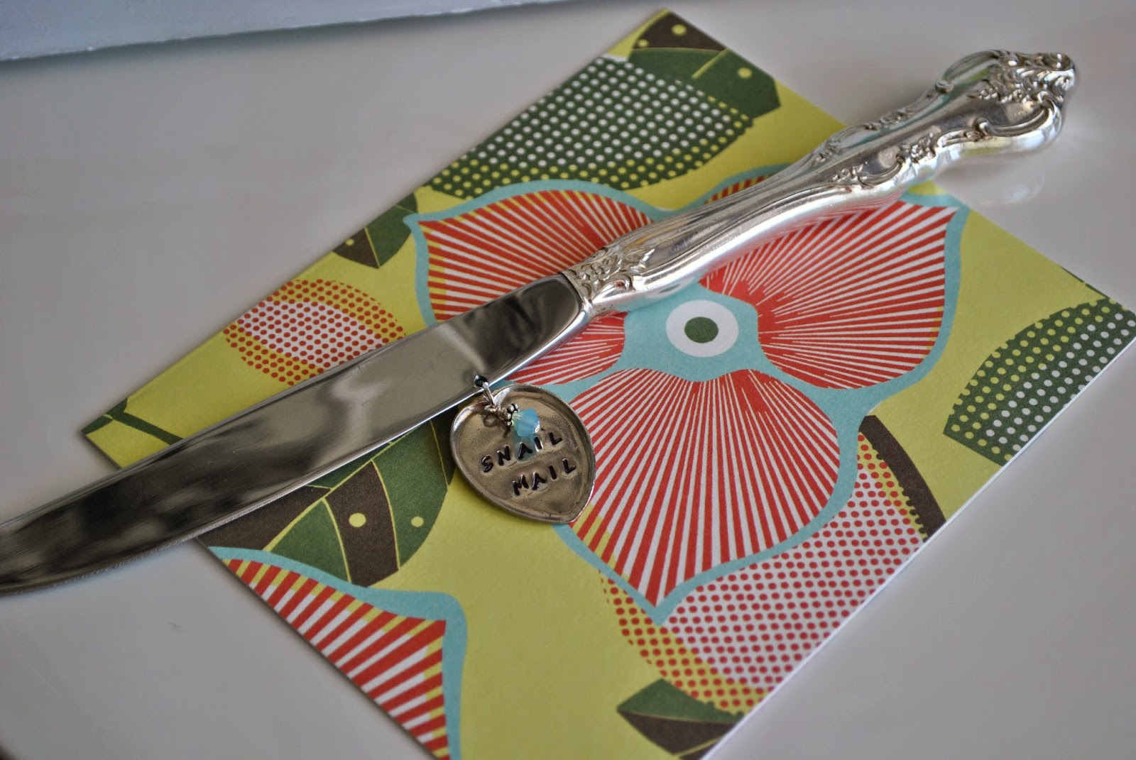 These vintage silver plate knives are unique with their 'Snail Mail' charm and Swarovski crystal. The above photo was influenced by an episode of 'Downton Abbey' where Carson presents Lord Grantham with a letter and opener on a silver tray. Time to make opening your mail, a special event.